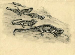 Oberthür (Joseph). Lézards amblyrtorynques des Galápagos. Lavis original, avec rehauts de blanc; 21,5 x 16 cm ; pet. bande ajoutée dans le haut.