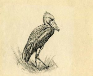Oberthür (Joseph). Baloeniceps ou Bec en sabot. Lavis original; 17 x 14 cm.