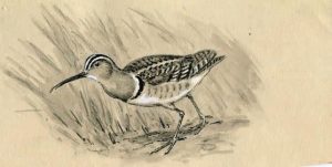 Oberthür (Joseph). Bécassine peinte. Lavis original avec rehauts de blanc; 17 x 9 cm.