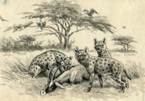Oberthür (Joseph). Hyènes tachetées. Lavis original; 21 x 15 cm.