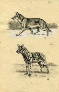 Oberthür (Joseph). «Cyon alpinus et Lycaon peint». Deux lavis originaux, sur une même page; 16 x 24,5 cm.