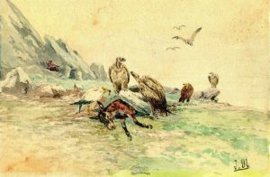 Oberthür (Joseph). Vautours près d’un âne mort, chasseur au loin. Aquarelle originale, signée des initiales; 23,8 x 15,8 cm.