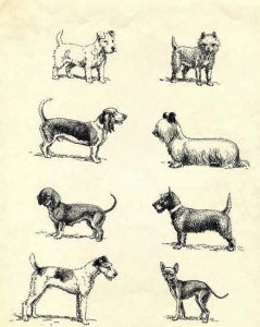 Oberthür (Joseph). Différentes races de chiens. Dessins originaux à l’encre sur une page, donnant huit sujets.