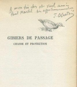 Oberthür (Joseph). Gibiers de passage. Chasse et Protection… 8 planches en hors-texte et 26 croquis in-texte. Paris, Durel, 1951; in-4 br., couv. iil.