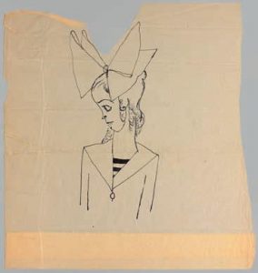 Cocteau (Jean). Marie Chabelska dans la petite Fille américaine de "Parade". Dessin original à l'encre, sur calque, exécuté en 1917; 30 x 32 cm; découpage dans le haut et fente.