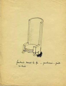 Cocteau (Jean). Recherche d'élément de décor pour la pièce "les chevaliers de la Table Ronde". Dessin original à l'encre de Chine annoté "Fauteuil devant le feu-parchemin-pieds d'ébène", exécuté vers 1937-1939; 22,5 x 28 cm.