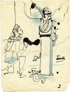 Cocteau (Jean). Œdipe et le Sphinx. Dessin original à l'encre de Chine, et crayon de couleur bleu, exécuté vers 1928; 20,5 x 27 cm; manque à 2 angles.