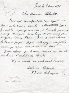 1er Mars 1926 : «Je n’ai pas oublié ce que je vous dois, ni l’amitié que vous m’aviez témoignée en un temps où vous auriez pu m’ignorer comme Dieu. Mais je suis absent de Paris à peu près depuis cette époque». - 19 Septembre 1928 : «Vous m’aviez dit vous intéresser assez spécialement au «Songé» de Strindberg. On s’inquiète de divers côtés de savoir si je reprendrai cette pièce. Les Allendé … qui se sont occupés du lancement de ce spectacle pensent qu’on pourrait réunir plusieurs belles salles...». - 23 Juin 1931 : «J’ai été très touché de la gentille pensée que vous avez eue de m’envoyer des cartes pour les conférences de Daudet. Malheureusement à Reims où je me trouve actuellement pour tourner les «Croix de Bois» je n’ai pu en profité… Permettez-moi de vous manifester mon irritation de votre négligence sur d’autres points à mon égard, et même d’une certaine désinvolture me concernant, signe au fond du peu de considération dans laquelle vous me tenez… En effet, je vous ai remis voici quelques mois 2 projets de mise en scène que vous m’aviez vous-même demandé de vous communiquer». Or il n’a plus eu de ses nouvelles, Hébertot préférant sans doute s’intéresser à des gens à qui va son estime… «Ensuite Léon Daudet qui fait bruyamment votre éloge dans l’A.F., 2 ou 3 fois par mois a loué hautement le disque…du «Squelette Laboureur», poème dont j’ai été le premier à mettre en relief devant vous l’étrange et saisissante beauté. Poème que tout le monde connait et dont personne ne parle». Il poursuit alors ses reproches en terminant «Je sais que vous m’aimez bien, mais d’une amitié qui ne se double d’aucune vraie estime. L’opinion générale sur moi a un peu trop déteint sur vous et c’est gênant». - 29 Juin 1932 : «Je joins à ma lettre…le n° contenant ma conférence sur la mise en scène et la métaphysique. J’insiste sur ce point que le théâtre que je veux faire serait conditionné par les voies que je formule dans le texte que vous allez lire et par celles que je développerai au cœur du manifeste qui paraitra dans la N.R.F…. Théâtralement la N.R.F. n’a pas de doctrine. Elle veut bien approuver ce que je lui propose et je considère que c’est un appoint sérieux pour moi d’avoir avec moi tout un milieu comme celui-là. Je cherche un homme qui puisse faire de mon projet une affaire viable, et commerciale car je ne veux pas m’occuper de questions d’argent… Il faut que cet homme croie que les idées qui seront formulées dans le manifeste…seront telles qu’elles puissent susciter et conditionner le théâtre que tout le monde attend, théâtre révolutionnaire…en réaction contre toutes les idées sur lesquelles on évoque le mot de théâtre en Europe en 1932».
