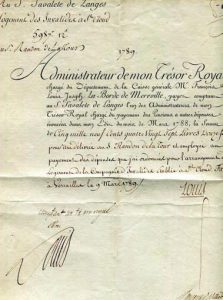 Ordre est donné à François Louis Joseph La Borde de Méréville de payer comptant à Mr Savalete de Langes la somme de 5987 livres, 12 sols pour être délivrée au sieur Randon de la Tour pour ses dépenses concernant l’arrangement de la Compagnie d’Invalides établie à St Cloud. Versailles, 9 Juin 1789.
