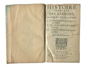 Histoire générale des Larrons, divisée en trois livres. I… les cruautez et meschancetez des Volleurs. II. Des Ruses et Subtilitez des Couppeurs de Bourses. III. Les Finesses, trompreries et stratagèmes des ilous… Rouen, Jean de la Mare, 1633; in-12 velin ivoire du XIXème siècle. Première édition de cet ouvrage réunissant les trois parties [Barbier II, 810, cité, par erreur, celle de 1636, n’ayant apparemment jamais connu celle-ci].