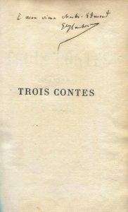 Trois Contes Un Cœur simple. La Légende de Saint-Julien l’Hospitalier. Hérodias. Paris, G. Charpentier, 1877; in-12 demi-chag. rouge, dos orné de fil. à fr. et de fleurons dor. (Reliure de l’époque). ÉDITION ORIGINALE. Un des 100 exemplaires sur HOLLANDE (n°12). ENVOI AUTOGRAPHE, signé d’E. ZOLA «à mon vieux Charles-Edmond».