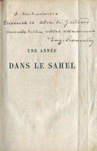 Une Année dans le Sahel. Paris, Michel Lévy, 1859; in-12 demi-chag. et perc. fauve, dos orné de fleurons dor. (Reliure de l’époque). ÉDITION ORIGINALE. ENVOI AUTOGRAPHE, signé à «Mesdemoiselles Elisabeth et Adèle de Gaillard, souvenir de son cordial attachement».