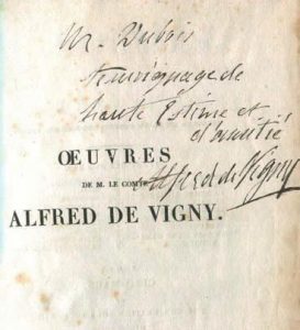 Poèmes… Seconde édition, revue, corrigée et augmentée. Paris, Gosselin, V. Canel, 1829; in-8 demi-bas. fauve, dos orné de fil. dor. (Reliure de l’époque us.). ENVOI AUTOGRAPHE, signé à M. Dubois «Témoignage de haute estime et d’amitié»; le haut du dos manque.