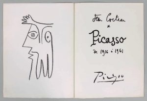 Picasso de 1916 à 1961. Lithographie de PICASSO. Monaco, Éditions du Rocher, 1962; in-4 en ff., couv. ill., emb. Édition réunissant tous les écrits de Cocteau consacrés à Picasso pendant 45 ans. 24 lithographies originales de Picasso sur papier report, dont 11 hors-texte. Exemplaire d’artiste sur Rives, SIGNÉ PAR J. COCTEAU ET P. PICASSO; pet. déchirure à la couverture.