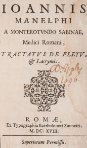 - loannis Manelphi, a Monterotundo sabinae, Medici Romani, Tractatus de Fletu, & Lacrymis. Romae, ex. Typographia Bartolomaei Zannetti, 1618. In-8, [8p]-120p-[20p] Texte dans un encadrement et marge. Plein vélin avec lacet. Excellent...