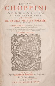 CHOPPIN (René) — Renati Choppini [...] De sacra politia forensi libri III ultima editio [suivi de] Monasticon seu de Jure Coenobitarum libri duo tertia editio [suivi de] De privilegiis rusticorum lib. III Ultima editio.