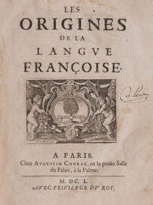 dictionnaire étymologique du français, composé par le grammairien, historien et écrivain Gilles Ménage (1613-1692). L'ouvrage est dédié aux frères Dupuy, Pierre (1582-1651) et Jacques (1591-1656). L'auteur entretenait une véritable relation à la fois intellectuelle et amicale avec ces deux personnages ; il fut notamment membre du fameux Cabinet des frères Dupuy qui perdurera jusqu'en 1696. Le dictionnaire est précédé d'un avertissement et discours sur l'affinité et la conversion des lettres et suivi d'additions et corrections puis de tables.