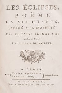 Edition originale française, avec le texte latin et la traduction en regard. Célèbre mathématicien et scientifique italien, Roger-Joseph Boscovich {1711-1787) il enseigna les mathématiques à Rome, à Milan, à Pavie. Ce beau poème sur les éclipses mêle à la fois détails relatifs aux sciences exactes et une ambiance poétique par le style élégant du poète.