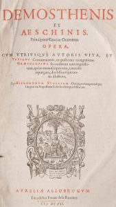 [DEMOSTHENE - ECHINE] - Demosthenis et Aeschinis Principum Græciæ Oratorum Opera, cum utriusque autoris Vita, & Vlpiani Commentariis [...] per Hieronymvm Vvolfivm [...]. Aureliae Allobrogum, excudebat Petrus de la roviere, 1607. In-folio,...