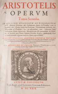 duobus Graecolatinis de Republica in supplementum Politicorum Aristotelis. Sed novissime huic editioni omnium quae hactenus prodierunt, ornatissimae accessit brevis ac perpetuus in omnes Aristotelis libros commentarius, sive Synopsis analytica doctrinae Peripateticae, non antehac visa ; in qua ut in expeditiore tabella, Aristotelis philosophia omnis, prout ea suo ordine descripta est, perspicue breviterque indicatur, & pro rerum dignitate exponitur. Authore Guillelmo Du Val Pontesiano [...] Paris, typis Regiis, apud Societatem Graecarum editionum [Antoine Estienne], 1629. 2 vol. in-folio, [32p]. (titre, dédicace à Louis XIII, préfaces, vie d'Aristote), 184 pp. [Synopsis analytica], 1251p. Tables (seuls 18 pages présentes il en manque autant. [2] ff. n. ch. (titre, dédicace à Guillaume Du Vair), 131 pp. [seconde partie de la Synopsis analytica], 1104p, [32p de tables] texte sur deux colonnes, Pleine basane. Reliure abîmée, mouillures. Deuxième tirage de cette édition bilingue latin-grec estimée, d'abord publiée en 1619, qui a été faite sur l'édition d'/saac Casaubon parue en 1590. [I.J.8]