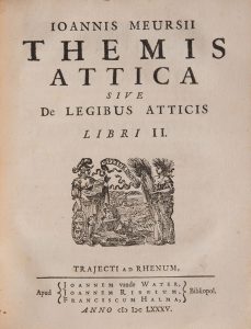 Piraeeo, liber singularis, Themis Attica Libri Il et in Helladii Chrestomathiam animadversiones omnia nunc primum prodeunt. Utrajecti, Apud Guiljelmum vande Water, 1685-1686-1687. 108p+index-51p+index-152p+index-71p+index. Plein vélin, dos lisse. Johannes van Meurs (1579-1639) est un érudit hollandais qui fut phi/ologue, lexicographe et historien d'expression latine. ll étudie les textes grecs dont il publie des éditions, ainsi que des traités d'archéologie et d'histoire. [l.J.6.]