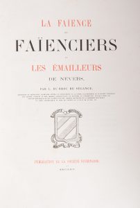 DU BROC de SEGANGE (Louis) - La Faïence, les faïenciers et les émailleurs de Nevers. Nevers, publication de la Société nivernaise, 1863. in-4 demi-chagrin. Edition originale illustrée de 21 planches hors texte dont plusieurs en camaÏeu ou...