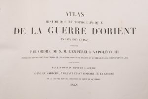 ATLAS Historique et topographique de la Guerre d'Orient en 1854-1855 et 1856. Paris, Dépôt de la Guerre, 1858. In-plano, cartonnage, couv. beige impr., lacets fermoirs (Cartonnage de l'éditeur). 11 ff. et XXXIV planches numérotées. Ouvrage de...