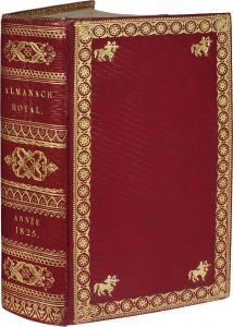 Almanach royal, pour l’an 1825. Paris, A. Guyot et Scribe, 1825. In-8, maroquin rouge, bordure de rosaces dorée, pièces d’armes (centaure) aux angles, dos lisse orné, coupes et bordure intérieure ornées, tranches dorées (Reliure de...