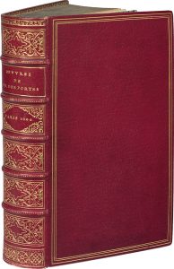 intérieure, tranches dorées sur marbrure (Brany). Dernière édition publiée du vivant de Desportes, « très complète, très belle et justement estimée », écrit Tchemerzine. Élégamment imprimée en caractères italiques, l’édition est ornée de jolis bandeaux typographiques à rinceaux et de lettrines foliacées. C’est l’une des dernières productions de Mamert Patisson, mort noyé l’année suivante. Elle porte sur le titre la marque de Robert Estienne, le premier éditeur des œuvres de Desportes en 1573, dont Mamert Patisson avait épousé la veuve et conservé le nom sur la plupart de ses impressions. Très bel exemplaire en maroquin rouge de Brany, qui exerçait à Paris durant le dernier tiers du XIXe siècle. Tchemerzine, II, 890 a.