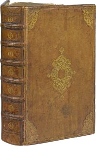 2 tomes en un volume in-folio, veau fauve, triple filet doré, écoinçons à fond azuré, cartouche central à fond azuré réservant un ovale, dos orné de fers azurés et de filets à froid, tranches dorées (Reliure de l’époque). T rès belle édition illustrée par Bernard Salomon de l’Histoire des Juifs dans la traduction de François Bourgoing. Le premier tome contient les vingt livres des Antiquités judaïques et l’Apologie des Antiquités contre Apion, Apolloine et Lysimaque ; le second tome, la Guerre des Juifs, en sept livres, le Martyr des Macchabées et la Vie de Flavius Josèphe écrite par lui-même. Typographiée avec art sur les presses de Jean de Tournes, l’édition fut partagée entre la succursale lyonnaise des Giunta et Jean Temporal (lequel en avait publié l’édition de 1558). Elle comprend 134 vignettes gravées sur bois par Bernard Salomon, dit le Petit Bernard, provenant de la suite des Quadrins historiques de la Bible (1553). Exemplaire réglé. Bel exemplaire à grandes marges dans une splendide reliure de l’époque. Mention ancienne sur le second contreplat : je suis a monmaitre ceux qui me trouverons qui me rande (sic). Restaurations aux coiffes, charnières et coins. Baudrier, VI, 305-307 - Gültlingen, IX, 221, n°523 - Brun, 227.