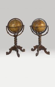 les calottes polaires ajoutées. Exceptionnelle paire de globes de parquet, terrestre et céleste, exécutés et publiés à Rome par Matthæus Greuter, considéré comme le tout premier grand fabricant de globes italiens. Rarissimes premières éditions à la date de 1632 pour le globe terrestre, et 1636 pour le globe céleste. D’une taille de 49 cm de diamètre, ce sont les plus grands globes fabriqués par Matthæus Greuter, qui a également réalisé des globes de 26,5 centimètres. Pour les exécuter, l’auteur s’est fortement inspiré des globes de 68 centimètres conçus par Blaeu en 1622, auxquels il a apporté des modifications. Le globe terrestre, dédié à Iacobo Boncompagno de Bologne, arrière-petit-fils du pape Grégoire XIII, est orné de quatre cartouches écrits en latin : un cartouche contenant un texte de présentation du globe « In ista quam exhibemus terreni globi descriptione omnium regionum iuxta et insularum quotquot hactenus ab Argonautis tam Lusitaniæ [...] Matthæus Greuter Auctor ANNO MDCXXXII » ; un cartouche de dédicace « Ill.m et Excellent.^ Principi D. Iacobo Boncompagno [...] Matthæus Greuter humill obseqij ergo DD », orné en tête des armoiries du dédicataire ; et deux cartouches, dont l’un contient des notes sur la détermination des longitudes, orné d’un globe et de deux personnages. Greuter se distingue de Blaeu en omettant de reporter les lignes loxodromiques ou lignes de rhumbs destinées à guider les navigateurs, et ne les mentionne pas dans le cartouche de présentation. Sans doute ne considérait-il pas son globe terrestre comme un instrument de navigation. Il a par ailleurs effectué ce que l’on peut considérer comme une mise à jour importante en faisant figurer, au nord du Japon, l’île de Yezo, actuelle Hokkaido, dont il aurait eu connaissance grâce à Christophoros Blancus, auteur de la première carte européenne du Japon représentant cette île, publiée à Rome en 1617. Ce détail échappe à Blaeu jusqu’en 1643, date du voyage de l’explorateur hollandais Maarten Gerritszoon de Vries en mer d’Okhotsk. Greuter serait donc le premier à faire figurer sur un globe l’île japonaise d’Hokkaido. En revanche il a respecté la plupart des informations géographiques du globe de Blaeu : bien que peu détaillée, la Nouvelle- France figure la ville de Québec, et le Saint-Laurent prenant sa source dans un lac, qui, d’après l’emplacement, serait le lac Ontario, lui-même juxtaposé à une immense étendue d’eau occupant l’emplacement des quatre futurs autres Grands Lacs de la région. Greuter aurait bénéficié des travaux de son contemporain Samuel de Champlain, et particulièrement de sa carte de la Nouvelle-France imprimée en 1632. A l’instar de Blaeu, Greuter a repris le toponyme de Nieu Nederland à l’emplacement de l’actuelle New York, que Blaeu fut le premier à utiliser sur une carte. Ce toponyme volontairement écrit en néerlandais servait à illustrer les revendications territoriales des Hollandais dans cette région. Conformément aux connaissances de l’époque, la Californie est représentée comme une île, tandis que l’Australie est appelée Olanda Nuova. Pour les noms des régions de l’Ancien Monde, et pour les mers, Greuter a utilisé le latin, mais il nomme l’Atlantique Mar del Nort et le Pacifique Mar del Zur, tandis que pour le Nouveau Monde, il a utilisé l’espagnol ou le portugais, parfois même l’anglais, le français, le hollandais ou la langue originaire de la région portant le nom. Pour ce qui concerne la décoration, les mers sont ornées de nombreux vaisseaux, monstres marins, roses des vents, et d’une représentation de Poséïdon jouant de la harpe en chevauchant un monstre marin et d’une sirène sonnant une conque marine. Pour accompagner son globe terrestre de 1632, Greuter prépare un globe céleste de mêmes dimensions, qu’il édite en 1636. Il se base à nouveau sur les globes de Willem Blaeu de 1622, mais aussi sur les observations de l’astronome danois Tycho Brahé, et leur rend hommage dans le cartouche de présentation : « In hoc cælesti Globo notantur omnes stellæ fixie, ad annum 1636 accomodatæ q iuxta observatione nob. viri Tychonis Brahæ in max. illo. Jansonij an. 1622 edito [...] ROMÆ 1636 M. Greuter exc. permissu superior » (Toutes les étoiles de ce globe céleste sont fixées pour l’année 1636 et positionnées conformément aux observations du noble Tycho Brahé, telles que représentées sur l’œuvre [le globe] extraordinaire de Jansson [Blaeu] , éditée en 1622 [...]). Pour représenter le nombre de degrés de longitude à ajouter ou à soustraire aux étoiles afin de rendre compte, au fil des décennies, de la précession des équinoxes, Greuter a simplement recopié un texte de Petrus Plancius. Les étoiles observées par le navigateur Pieter Dirkszoon Keyser (latinisé en Petrus Theodori) autour du Pôle Sud, sont également reportées. Le cercle équatorial, les tropiques, les cercles polaires, les équinoxes, les colures des solstices, l’écliptique et les méridiens sont tous représentés. Hormis les constellations traditionnelles attribuées à Ptolémée, et celles récemment découvertes dans l’hémisphère Sud, notamment par Frederik de Houtman, le globe figure également deux constellations découvertes par l’astronome allemand Jakob Bartsch, toutes deux absentes chez Blaeu : Camelopardalis (la Girafe) et Unicornis (la Licorne). Le globe céleste de Greuter diffère aussi de celui de Blaeu par l’addition, au sein de Ursa Maior, d’une ancienne représentation de cette constellation, nommée Plaustrum. Les constellations sont finement dessinées et coloriées, avec leurs noms en latin. Né à Strasbourg en 1556, Matthæus Greuter étudia d’abord la peinture et la gravure. Au début du XVIIe siècle, il quitta Avignon pour Rome, où il put mettre à profit son métier de cartographe et de grav