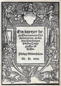 tranches vertes (Reliure de la fin du xixe siècle). Rare édition, probablement la première en allemand, de la lettre de Melanchthon au landgrave Philippe de Hesse, que le réformateur venait de convertir à la cause protestante. L’opuscule avait été composé et publié la même année en latin sous le titre d’Epitome renovatæ ecclesiasticæ doctrinæ. Le titre est orné d’un remarquable encadrement gravé sur bois d’après Lucas Cranach représentant deux cerfs couchés et quatre putti tenant des cornes d’abondance. Aucun exemplaire de cette édition n’est répertorié dans les bibliothèques publiques françaises, une douzaine dans les collections allemandes. De la bibliothèque Ambroise Firmin-Didot (1882, I, n°350, donnant Wittemberg comme lieu d’impression présumé), avec ex-libris. La date d’impression poussée au dos du volume est erronée et la signature du relieur illisible. VD16, M-3233 - USTC, 644484.