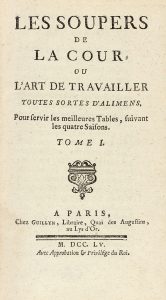ocre, tranches rouges (Reliure pastiche). Édition originale d’un des plus importants recueils culinaires du xviiie siècle, de toute rareté. Les Soupers de la Cour est l’ouvrage le plus estimé de Menon. Il contient plus de deux mille recettes qui concernent viandes, poissons, pâtisseries, huîtres, omelettes et l’office (conserves, confitures, pastillages et sables décoratifs). Ses menus saisonniers mentionnent la décoration des repas avec le service indiqué en marge. L’ouvrage connut une seconde édition en trois volumes en 1778. Cette première édition manque à Orsi, Vieil, Simon, Pennell, Dartois, Walterspiel, Wretman, Crahan, Oberlé. Bel exemplaire, paraphé par l’auteur au bas de l’avertissement, dans une reliure pastiche très soignée. De la bibliothèque Jean-Paul Lacombe, chef doublement étoilé du restaurant Léon de Lyon, avec ex-libris. Rares piqûre de ver, toutes marginales, titre du tome III habilement renouvelé. Vicaire, 591 - Bitting, 321 - Cagle, 344 - Drexel, 134.