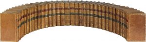 ; à D’Alembert, etc. Paris, Charles Pougens, 1798. (1 vol.). Soit 35 volumes in-18, veau moucheté, fine roulette dorée, dos lisse orné de lyres dorées, pièces de titre rouge et de tomaison verte, filet sur les coupes, tranches jaunes mouchetées (Reliure de l’époque). Jolie édition, très bien imprimée par Beaumarchais à Kehl, avec le matériel typographique acheté à la veuve du célèbre imprimeur et graveur Baskerville de Birmingham. C’est à lui aussi que Beaumarchais emprunta la technique de fabrication du papier vélin. Cette édition fut publiée concurremment avec le fameux Voltaire de Kehl, imprimé aussi par Beaumarchais en 70 volumes in-8. La collection complète compte 34 volumes, dont 10 de suppléments, et l’on a joint à cet exemplaire l’édition de Charles Pougens des lettres de Rousseau à Madame de Créqui, à la Maréchale de Luxembourg, Malesherbes, D’Alembert, etc., formant un trente-cinquième volume relié quasiment à l’identique (pièce de tomaison renouvelée). Les tomes XV à XVIII, consacrés à l’œuvre musicale de Rousseau, renferment 19 planches dépliantes ; et le volume ajouté, un fac-similé dépliant et 6 pp. de musique gravée. Bel ensemble dans une reliure de l’époque particulièrement décorative. De la bibliothèque Merle-Lagorce, avec ex-libris manuscrit du temps. Menus défauts d’usages. Petite galerie de ver dans le tome I. Dufour, n^^ ^ ^