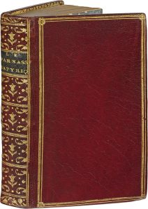 siècle). Très rare édition de ce célèbre recueil de poèmes licencieux et satiriques, faite en Hollande sur celle de 1660. La publication du Parnasse satyrique, en 1622, valut à Théophile de Viau d’être condamné au bûcher, sentence qui déclencha un scandale et une guerre de libelles sans précédent dans l’histoire littéraire française et se vit commuée en arrêt d’exil perpétuel. Très bel exemplaire en maroquin rouge du xviiie siècle.Une des gardes blanches comporte une notice manuscrite contemporaine de la reliure. De la bibliothèque de la famille de Laussat, avec ex-libris du XIX siècle. Minuscule accroc sur une coiffe. Gay-Lemonnyer, III, 650 - Pia, 1011 - Cf. Willems, n°1705, pour l’éd. de 1660.