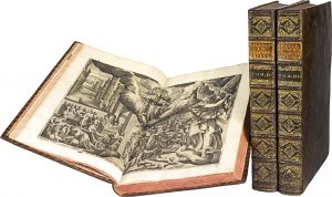 dos orné, pièces de titre fauve et de tomaison brune, tranches mouchetées (Reliure vers 1700). Édition originale de ce monumental ouvrage sur le Temple de Salomon à Jérusalem. Somptueuse illustration gravée sur cuivre, préfiguration du style baroque, composée de 3 titres-frontispices, 7 planches dépliantes, 17 à double page, 7 à pleine page, 2 vignettes, et des vignettes gravées sur bois dans le texte (diagrammes géométriques, plan de Jérusalem, etc.). Des bibliothèques du jésuite Antonio Magnani (1743-1811), bibliothécaire de l’Institut des Sciences de Bologne ; de l’Archiginnasio de Bologne, avec cachets annulés pour double ; de René Alleau (1917-2013), alchimiste, directeur de Bibliotheca hermetica aux éditions Denoël et ami d’André Breton, avec ex-libris. Bel exemplaire bien conservé, malgré quelques défauts d’usage et discrètes restaurations à la reliure.