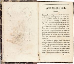 lisse orné de motifs dorés, pièce de titre citron, tranches jonquille, chemise et étui en demi-maroquin vert moderne (Reliure de l’époque). Nouvelle édition de ce recueil pédagogique illustré de nombreuses vignettes animalières gravées sur bois. Exemplaire de Camille Corot (1796-1875), orné d’une esquisse originale au crayon représentant deux silhouettes au pied d’un bosquet d’arbres au verso du titre, signé et daté C. Corot 1833 au recto du même feuillet. Reliure usagée, exemplaire défraîchi et incomplet du faux-titre. Bénézit, III, 179.