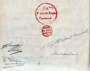 chiffre couronné doré au centre du plat supérieur, dos orné, tranches rouges (Reliure de l’époque). Première édition allemande, la plus complète de cet important ouvrage sur les coraux, traduite et augmentée d’après l’édition originale anglaise publiée à Londres en 1755. Elle renferme un frontispice et 46 planches dépliantes gravées sur cuivre, parmi lesquelles sept planches (n^9-46) ne se trouvaient pas dans les éditions anglaise, française et hollandaise de l’ouvrage. Précieux exemplaire de séduisante provenance, relié au chiffre de Frédéric II de Prusse, avec le cachet de la Bibliothèque royale de Berlin, annulé. Des bibliothèques Jean-Baptiste Huzard (1842, I, n°3808), avec cachet autographié et une notice de sa main sur une garde blanche ; Hardouin Michelin (1868, n°93), avec sa signature et des légendes autographes précisant pour chaque espèce représentée sur les planches son nom latin ; André-Eugène Malard-Duméril, directeur du Muséum de l’île Tatihou, avec sa signature ; et enfin Pierre Lambert (1982, n°195), avec ex-libris et signature. Reliure épidermée, coiffes manquantes. Nissen : ZBI, n°1282.