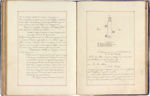 mention Vénérable en lettres dorées, dos lisse titré Maçonnerie en doré (Reliure du début du xixe siècle). Copie manuscrite du Rite écossais ancien et accepté pour les trois degrés symboliques. Calligraphiée à l’encre brune et rose sur 78 feuillets réglés d’un double filet rouge et agrémentée de quelques schémas dessinés à la plume, la copie est ainsi composée : [1] f. de titre, 54 pp. pour l’Apprenti (sans pp. 25-26, mais le texte paraît complet), [58] pp. pour le Compagnon et [44] pp. pour le Maître. Exemplaire contresigné Huviel ou Huriet (?) au début et à la fin de chaque partie. Réalisé dans la seconde moitié du XIXe siècle, il a été monté dans une reliure maçonnique plus ancienne. Plat inférieur détaché, coiffes manquantes, quelques taches d’encre et salissures sur le texte.