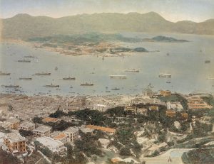 premier d’un décor montrant trois personnages en costume de samouraï plaqué or, aux visages et mains en ivoire, dans un jardin chinois, dos de cuir rouge, roulette intérieure, tranches dorées, emboîtage de toile écrue moderne titré « Hong Kong 1890 » (Reliure de l’époque). Exceptionnel témoignage sur Hong Kong à la fin du xix^ siècle, l’album renferme 24 grandes vues coloriées, dont une vue panoramique de la baie et du Pic Victoria en quatre volets, panoramas du port, de Kowloon, North Point, la flotte américaine au port, Queen’s road, les jardins publics, le racing, le tramway et l’Union Church, Peak Hotel, etc. Superbe reliure japonaise ornée de laques dorés et incrustés d’ivoire. Fine cassure sans gravité sur les plats, dos refait.