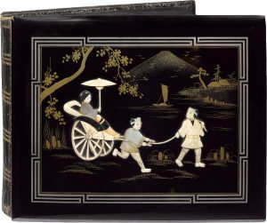 marqueterie de nacre, os et ivoire teinté, le tout dans un décor doré, dos de basane noire (Reliure de l’époque). Intéressant témoignage, l’album renferme quelque 500 photographies argentiques, à savoir environ 350 au format (5,5 x 8 cm), 150 au format (8,5 x 12,5cm) et 6 à pleine page (22 x 27cm) dont 4 représentant la Grande Muraille de Chine, et 10 photographies coloriées de geïsha. On y trouve aussi de nombreuses vues de pagodes, temples, paysages ou encore portraits de paysans ou de villageois. Quelques reproductions photographiques montrent des soldats japonais au combat, notamment pendant la bataille de Shanghaï (1937).