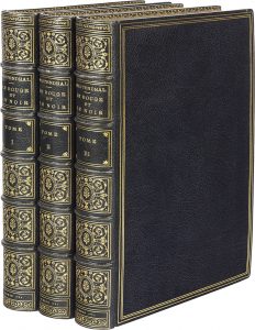 Stendhal. Le Rouge et le noir. Réimpression textuelle de l’édition originale. Paris, L. Conquet, 1884. 3 volumes grand in-8, maroquin bleu, triple filet doré, dos orné aux petits fers dorés, filets sur les coupes, dentelle intérieure,...