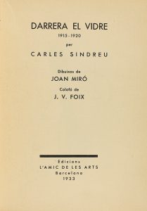 1933. (VANGUARDIAS). SINDREU, CARLES; MIRO, JOAN: DARRERA EL VIDRE. Barcelona: L´ Amic de les Arts, 1933. 8º. 60 p. aprox. Láminas ilustradas por Joan Miró. Rústica editorial.