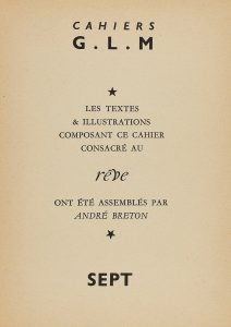 1938. (VANGUARDIAS). BRETON, ANDRE: CAHIERS G.L.M. Paris: SEPT, 1938. 8º. 132 p. 18 ilustraciones de las que 4 son en láminas fuera de trexto, realizadas por Chirico, Tanguy, Masson, Ernst, Magritte, Man Ray, Dali, Dominguez, Maurice Henry, etc....