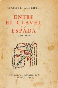 1941. (VANGUARDIAS-1ª EDICION). ALBERTI, RAFAEL: ENTRE EL CLAVEL Y LA ESPADA. Buenos Aires: Ed. López, 1941. 8º mayor. 195 p., 1 h. Ilustr. con 8 láms. y un retrato por Maria Carmen. Enc. en tela, conserva la rústica ilustrada por el autor....