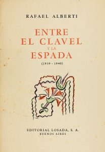 1941. (VANGUARDIAS). ALBERTI, RAFAEL: ENTRE EL CLAVEL Y LA ESPADA (1939-1940). Con ocho dibujos originales, retrato por la escultora Maria Carmen. Buenos Aires: Edit. Losada, 1941. 8º mayor. 195 p., 1 h. Rústica ilustrada por el autor.