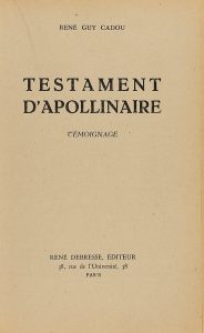 1945. (VANGUARDIAS-1ª EDICION). GUY CADOU, RENE: TESTAMENT D´APOLLINAIRE. Paris: Ed. René Debresse, 1945. 8º. 190 p., 1 h. Rútica editorial.
