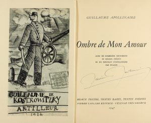 1947. (VANGUARDIAS). APOLLINAIRE, GUILLAUME: OMBRE DE MON AMOUR. Vésenaz près Genève: Pierre Cailler, 1947. 8º mayor. 145 p. Rústica. Frontis con lámina impresa por ambas caras y varias láminas. Rústica editorial. Buen estado de conservación.