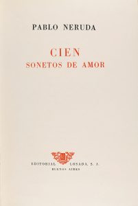 1960. (VANGUARDIAS-1ª EDICION). NERUDA, PABLO: CIEN SONETOS DE AMOR. Buenos Aires: Ed. Losada, 1960. 4º mayor. 124 p. Enc. en tela con sobrecubierta ilustrada por BALDESARI.