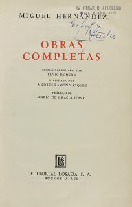 1960. (GENERACION 27). HERNANDEZ, MIGUEL: OBRAS COMPLETAS / Edición ordenada por Elvio Romero y cuidada por Andrés Ramón Vázquez. Prólogo de María de Gracia Ifach. Argentina: Ed. Losada, 1960. 8º. 996 p. Frontis con retrato del autor....